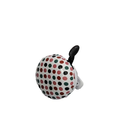 Mellemstor ringeklokke i hvid og med forskellige farver prikker, som er specielt god til børnecykler.